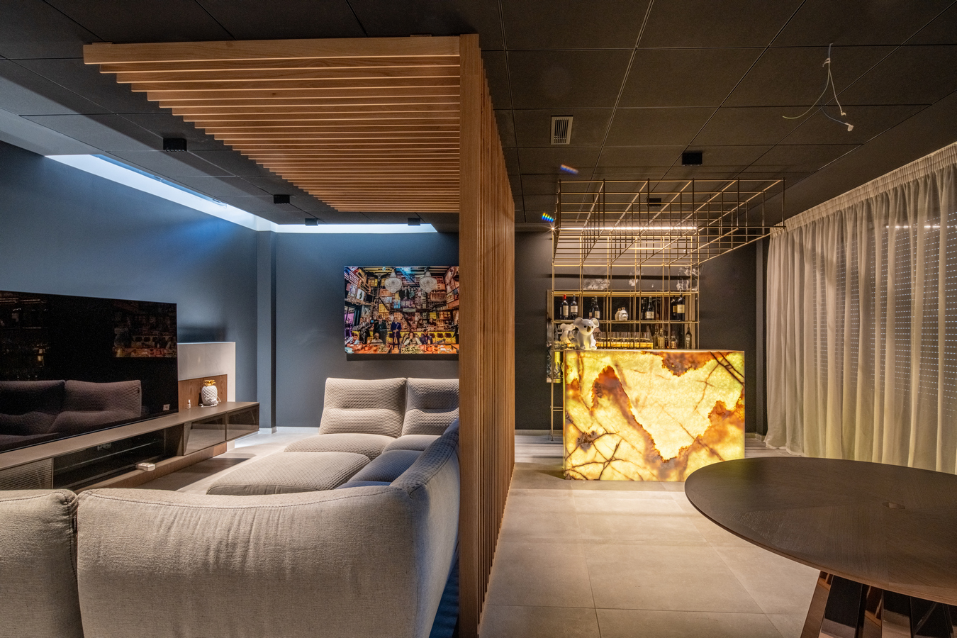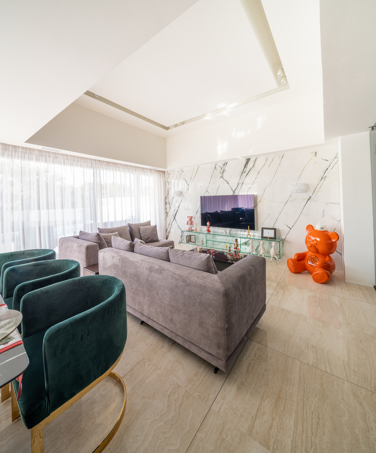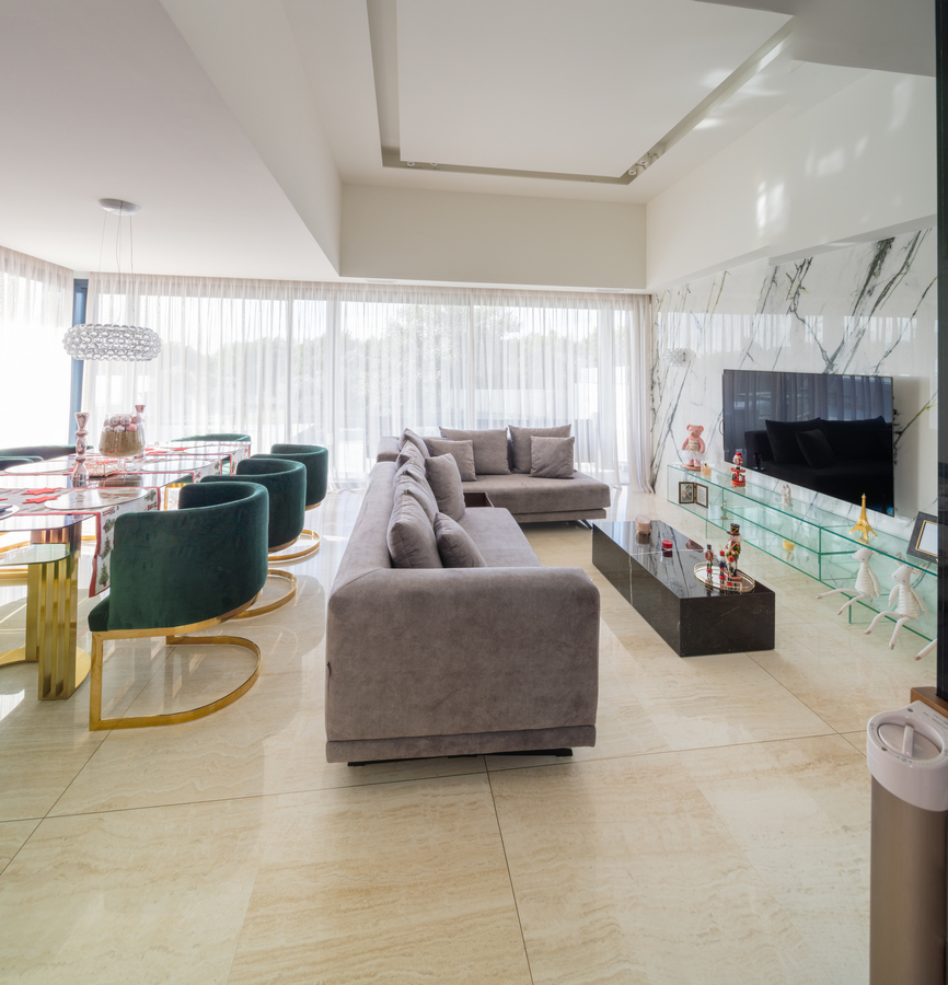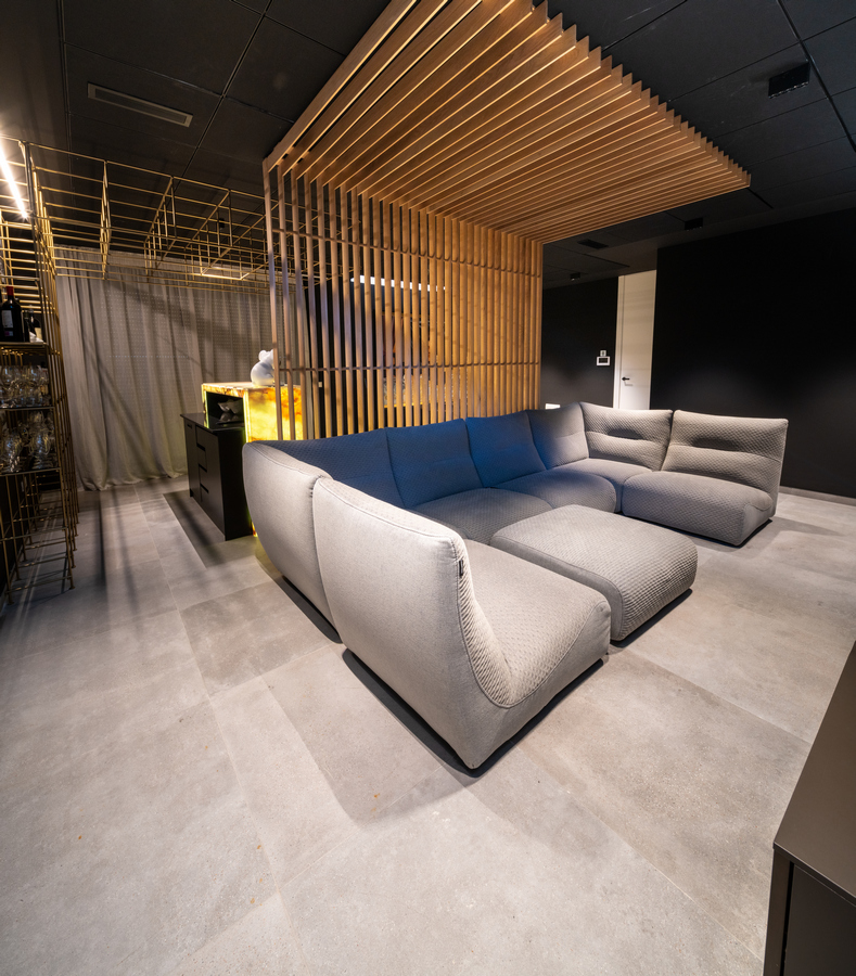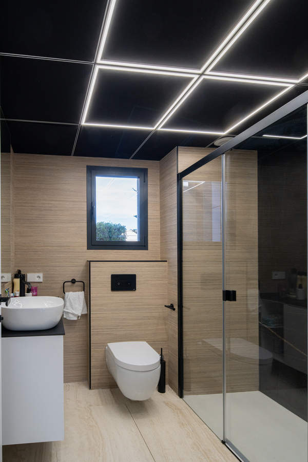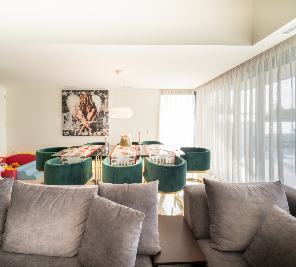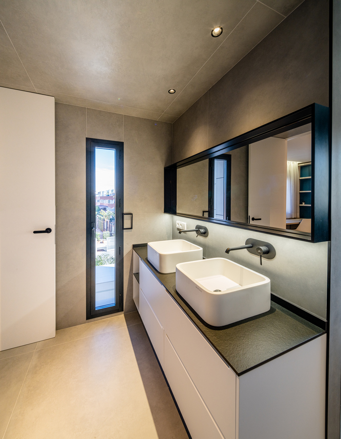 La utilización de grandes ventanas consigue lograr esa conexión entre el mundo interior y exterior permitiendo que la luz inunde todas las estancias. El mobiliario, el tratamiento acústico y las luces indirectas crea un espacio para habitar elegante y plenamente contemporáneo.