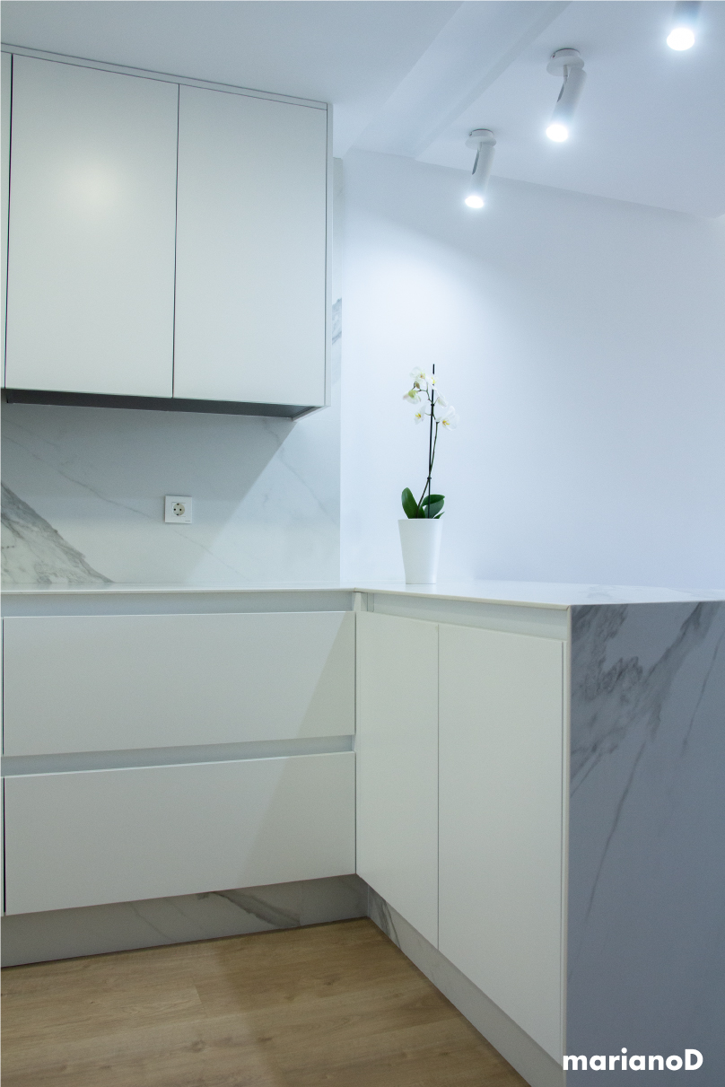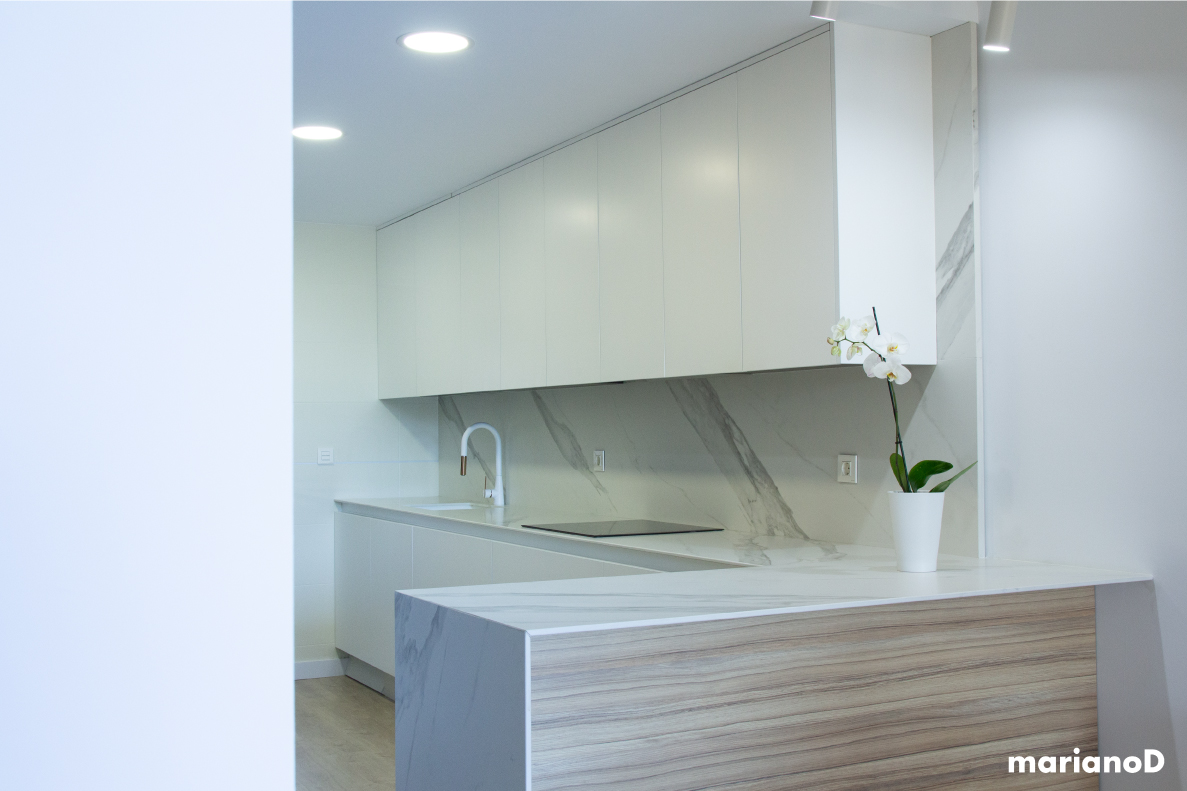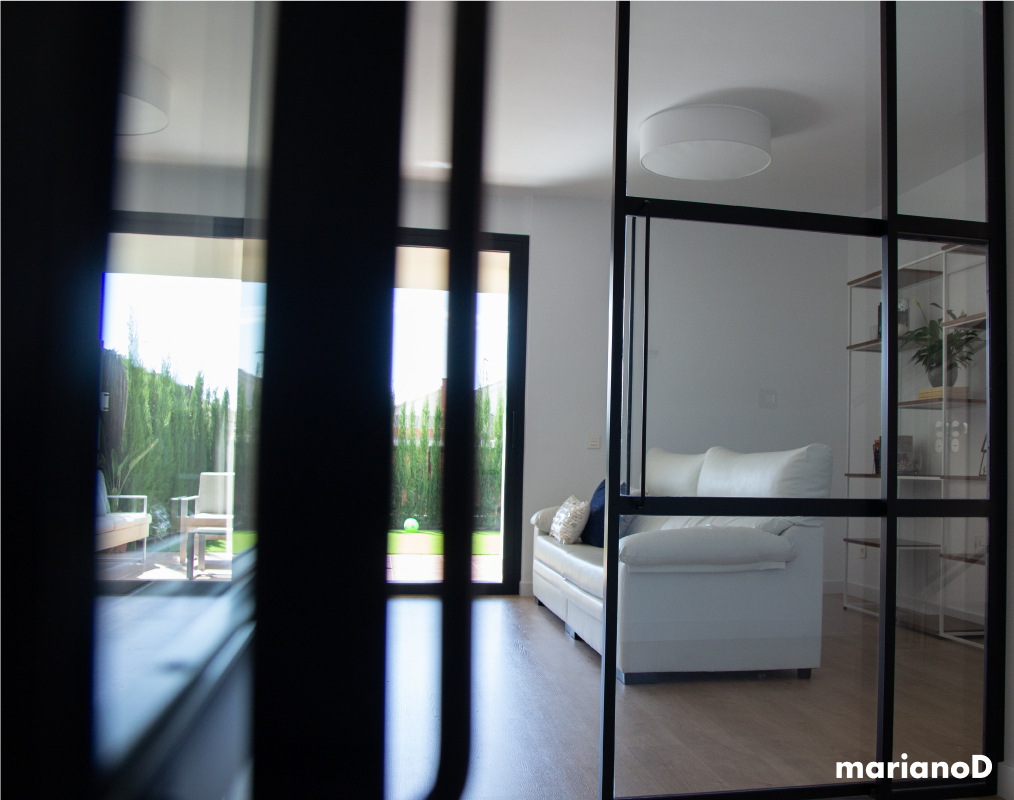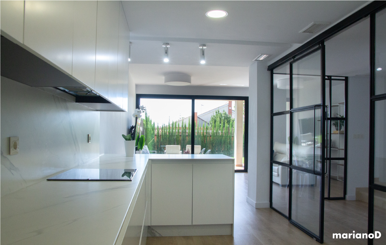 La vivienda esta situada en una urbanización al norte de la ciudad de Murcia, con amplios espacios y mucha luz natural. Los clientes querían algo con predominio de colores blancos que con pequeños toques da vida a la casa. Desde la entrada se ve la cocina y parte del salón gracias a una gran cristalera realizada en hierro lacado en color negro con puertas correderas que separan las estancias pero da igual que este abiertas o cerradas porque nos da sensación de lo grande que son los espacios. Los focos de la cocina son de la marca NORDLUX en color blanco. La encimera de la cocina esta realizada en compacto tipo mármol blanco.
