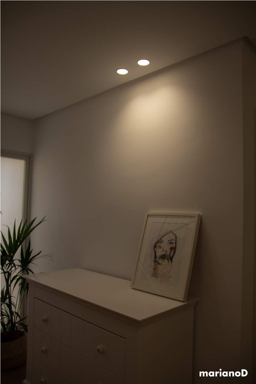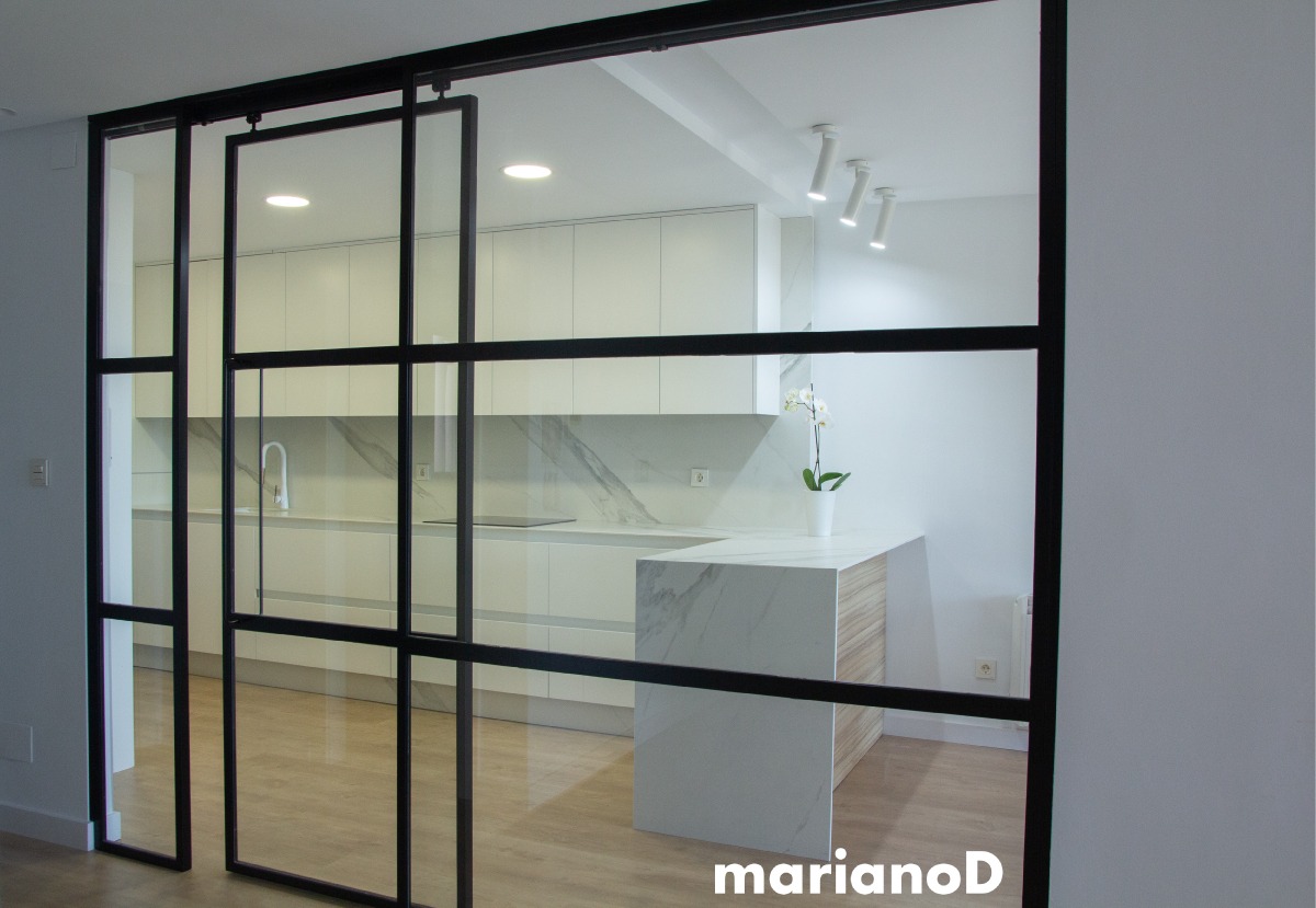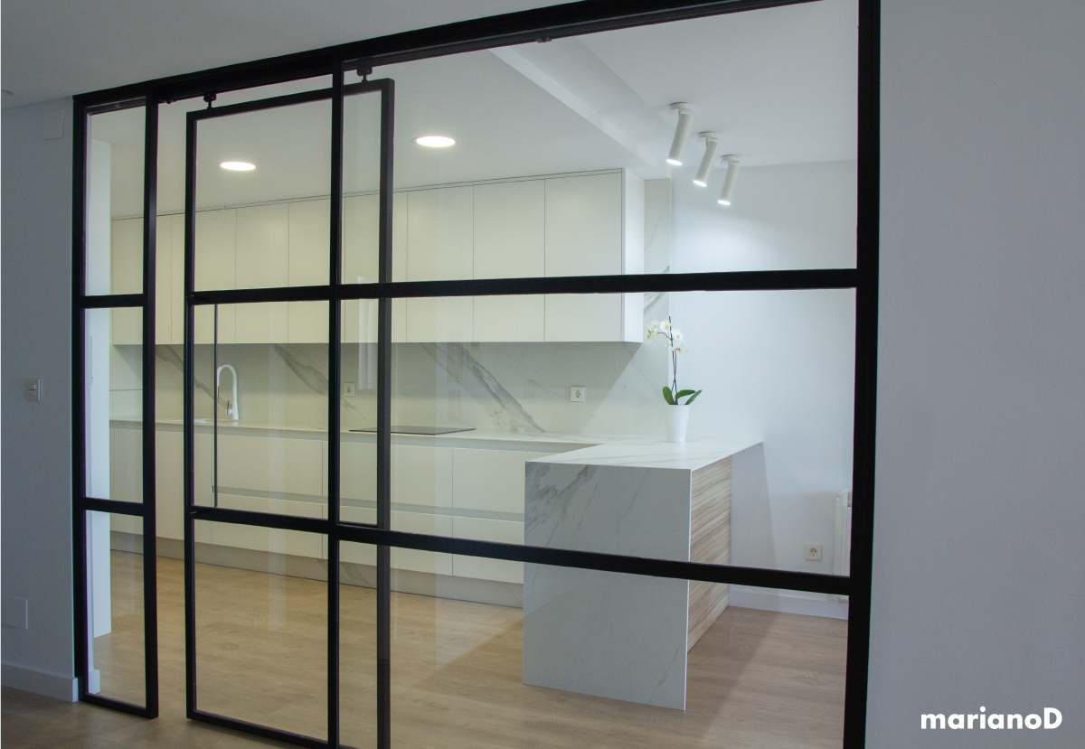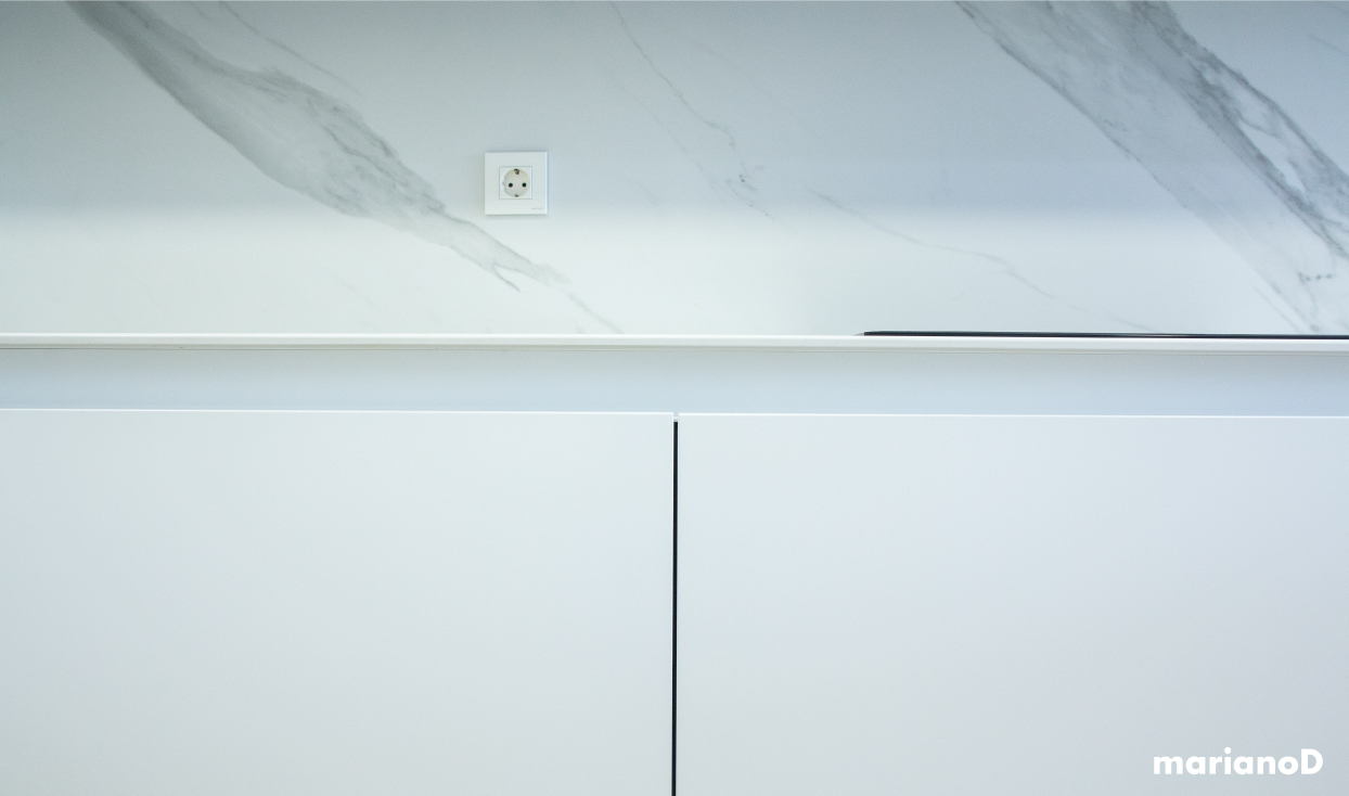 La vivienda esta situada en una urbanización al norte de la ciudad de Murcia, con amplios espacios y mucha luz natural. Los clientes querían algo con predominio de colores blancos que con pequeños toques da vida a la casa. Desde la entrada se ve la cocina y parte del salón gracias a una gran cristalera realizada en hierro lacado en color negro con puertas correderas que separan las estancias pero da igual que este abiertas o cerradas porque nos da sensación de lo grande que son los espacios. Los focos de la cocina son de la marca NORDLUX en color blanco. La encimera de la cocina esta realizada en compacto tipo mármol blanco.